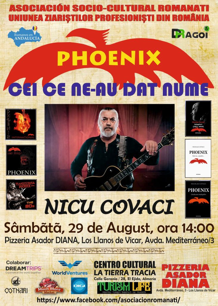 Sâmbătă, 29 August 2020 de la ora 14.00 in cadrul întâlnirilor „Noche Temática Intercultural” organizate de Asociación Socio-Cultural Romanati, El Ejido va fi alături de comunitatea româneasca din Almería artistul NICU COVACI, fondatorul Phoenix, cu o prezentare a unei prestigioase activități profesionale : scriitor, pictor, sculptor, muzician.