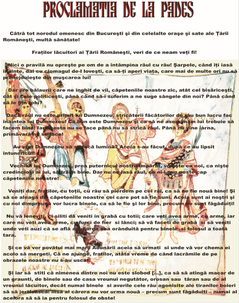 Tudor îşi lansează la Padeș celebra proclamaţie, care era primul document al revoluţiei. Tonul folosit era dur, gata să incite țăranii și micii meseriași: „Dar pre balaurii care ne înghit de vii, căpeteniile noastre zic, atât cele bisericeşti, cât şi cele politiceşti, până când să-i suferim a ne suge sângele din noi? Până când să le fim robi?” Prin această proclamaţie a nemulțumit marea boierime. Dar cei care știau adevărul acțiunii lui Tudor au citit mai atent finalul proclamației care era liniștitor. Apar niște nuanțe care îl remarcă pe Tudor ca un fin diplomat. „Să ştiţi că nimenea dintre noi nu este slobod, în vremea aceştii Adunări-obştii folositoare-ca să se atingă măcar de un grăunti, de binele sau de casa vreunui neguţător, orăşan sau ţăran, sau de al vreunui locuitor, decât numai binele şi averile cele rău agonisite ale tiranilor boieri să se jărtfească;însă ale celor cărora nu vor urma nouă – precum sunt făgăduiţi – numai ale acelora să se ia, pentru folosul de obşte”.