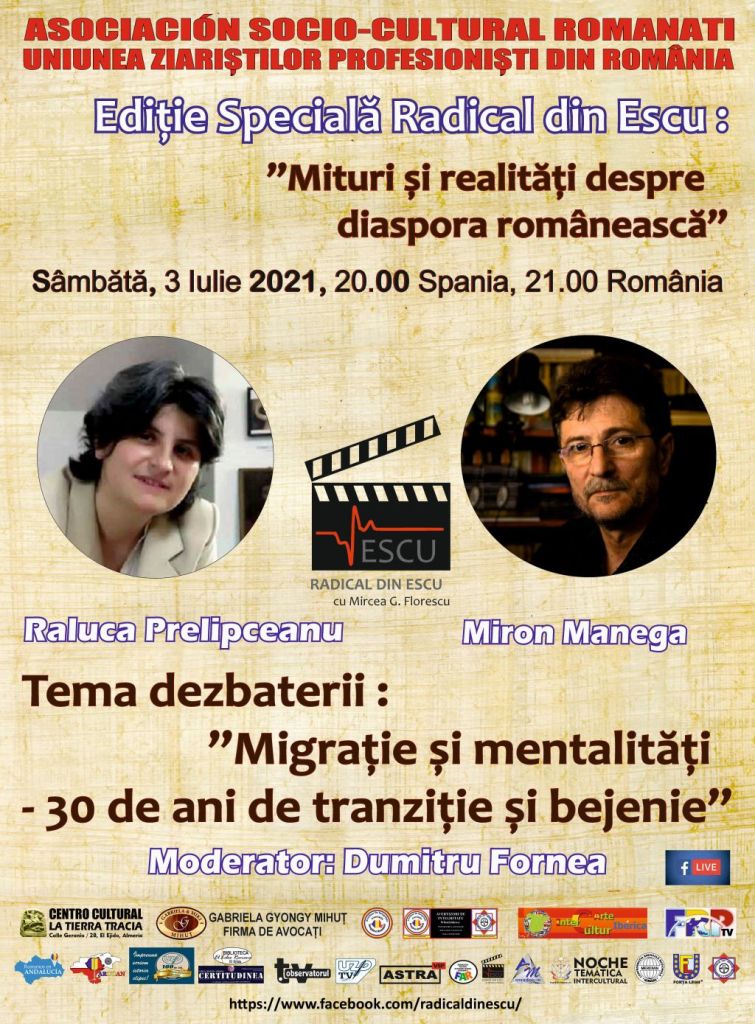 Sâmbătă, 3 Iulie 2021, ora 20.00(Spania), 21.00(România), invitat special la Radical din Escu a fost Raluca Prelipceanu, profesor și eseist, doctor în științe economice (migrație) al Universității Paris I Sorbona și iubitoare a patrimoniului. I s-au alăturat temei de discuție: Dumitru Fornea, Secretar General al Confederației Sindicale Naționale Meridian, Membru al Comitetului Economic și Social European impreună cu jurnalistul și scriitorul Miron Manega, director Publicația Certitudinea, Emanuel Cioacă, Președinte FRP-TV și Dr. Mihaela Cuțui.
