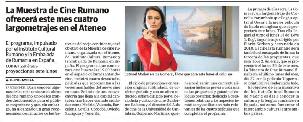 În perioada 6 – 27 septembrie, Institutul Cultural Român și Ateneul din Santander prezintă o selecție de filme românești recente, care fac parte din programarea Lunii filmului românesc la Santander.