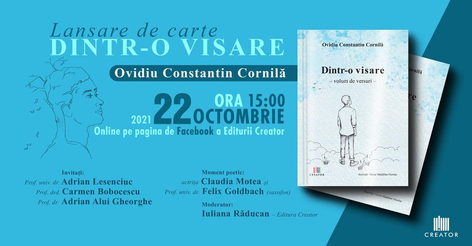 Vă invităm cu drag vineri, 22 octombrie, ora 15, pe pagina de Facebook a Editurii Creator, la lansarea volumului de poeme ,,Dintr-o visare” de Ovidiu Constantin Cornilă.
