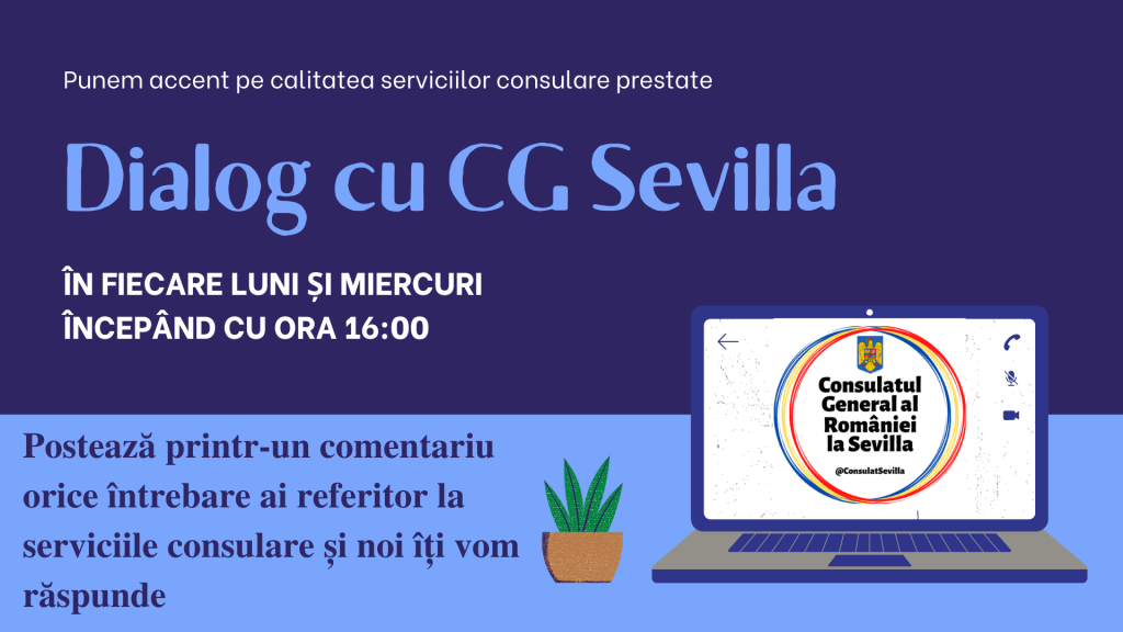 Având în vedere dorința noastră de a veni în sprijinul comunității, pe pagina oficială de Facebook a Consulatului (https://www.facebook.com/ConsulatSevilla/), vom demara începând cu 01.11.2021 un proiect ce presupune un dialog, live, cu funcționari ai oficiului consular, prin intermediul căruia le puteți adresa întrebările voastre privind serviciile oferite de Consulatul General al României la Sevilla: