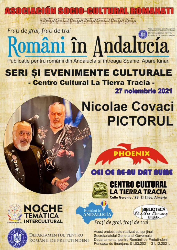 Sâmbătă, 27 noiembrie 2021, de la ora 19.00 vă invităm la o fascinantă incursiune in lumea artele plastice impreună cu Nicu Covaci, fondatorul Phoenix la Centro Cultural La Tierra Tracia El Ejido, Almería, Spania.