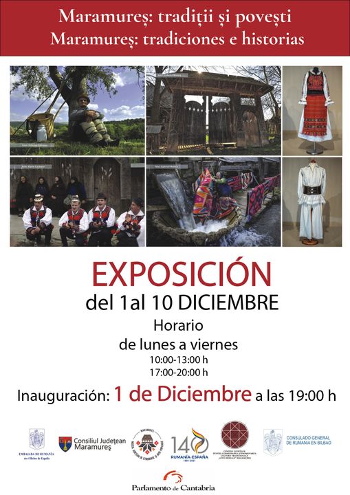 Maramureș: tradiții și povești”Expoziția se poate vizita in perioada 1-10 decembrie 2021, de luni până vineri, în intervalele orare 10:00-13:00 și 17:00-20:00, în Palatul Parlamentului (C/ Alta, 31-33 / 39008, Santander, Cantabria, España).