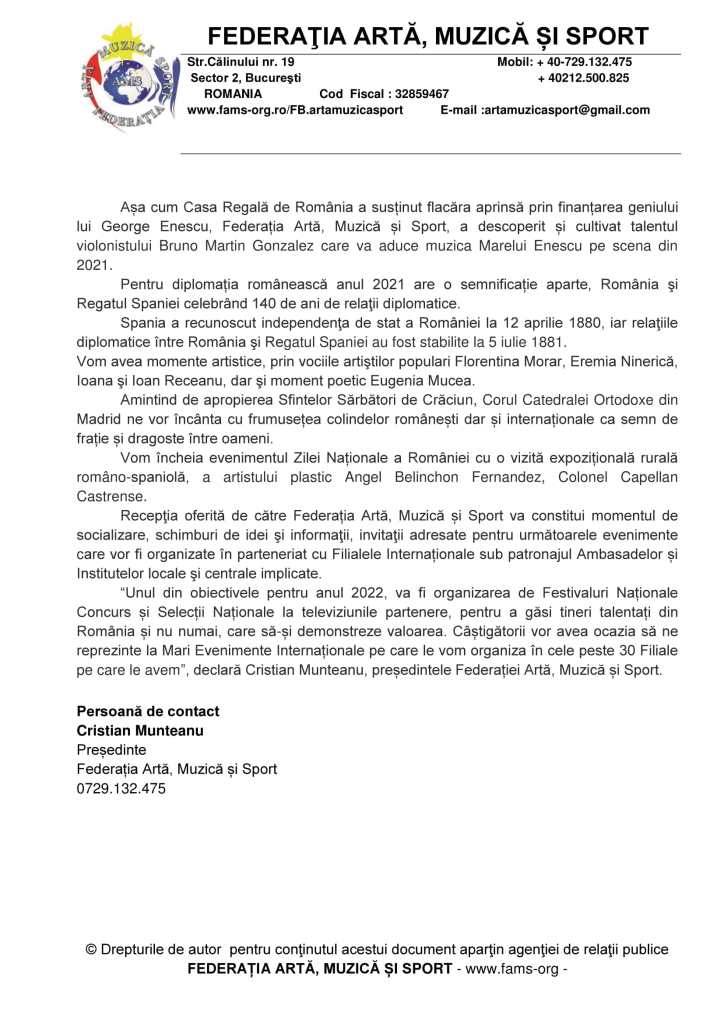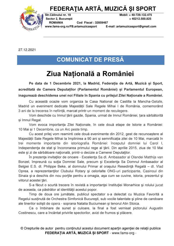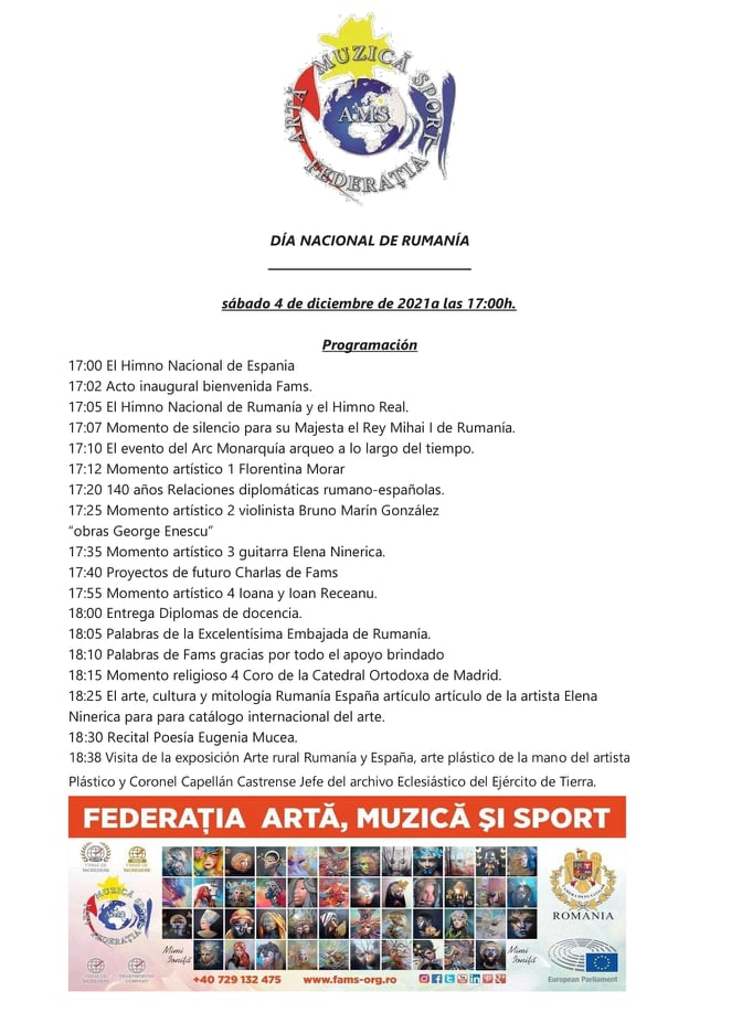 Anunțuri/Publicitate, La zi Ziua Națională a României sărbătorită la Madrid Dată: 28 noiembrie 2021Autor: Redacția Români în Andalucía 0 Comentarii Partajează asta: Dă clic pentru a partaja pe X(Se deschide într-o fereastră nouă) X Dă clic pentru a partaja pe Facebook(Se deschide într-o fereastră nouă) Facebook Apreciază Încarc... Similare