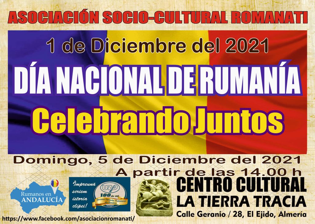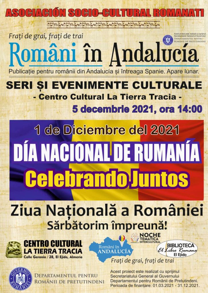 ROMÂNI IN ANDALUCÍA – “Frați de grai, frați de trai” – Sărbătorim impreună Ziua Națională a României, duminică, 5 decembrie 2021 de la ora 14:00 la Centro Cultural La Tierra Tracia, Calle Geranio/28, El Ejido.