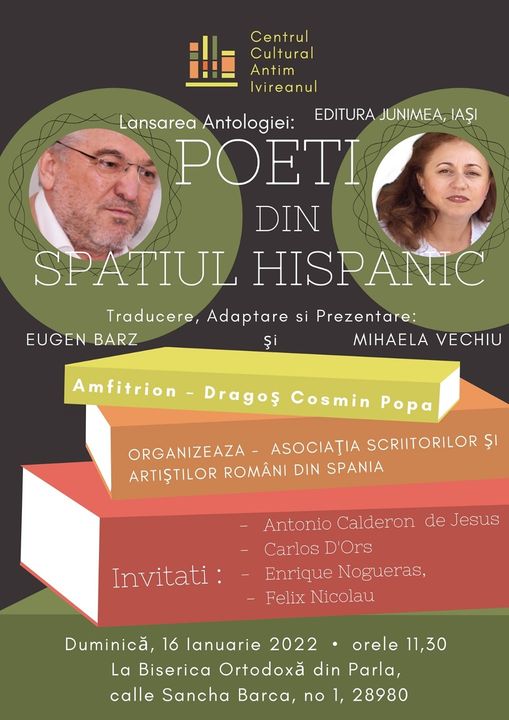 Duminică 16 ianuarie, 2022, de la ora 11,30, la Biserica din Parla va avea loc lansarea Antologiei „Poeți din spațiul hispanic” . Traducători: Eugen Barz și Mihaela Vechiu .