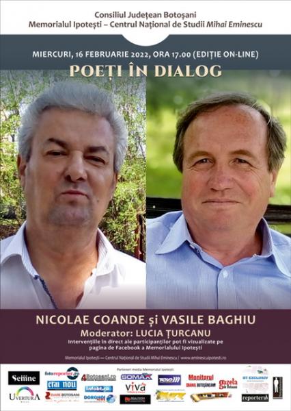 Pe data de 16 februarie 2022, la ora 17.00, Memorialul Ipotești – Centrul Național de Studii „Mihai Eminescu” organizează o nouă ediție a întâlnirilor Poeți în dialog. Invitații acestei luni sunt Nicolae Coande și Vasile Baghiu. Discuția va fi moderată de Lucia Țurcanu.