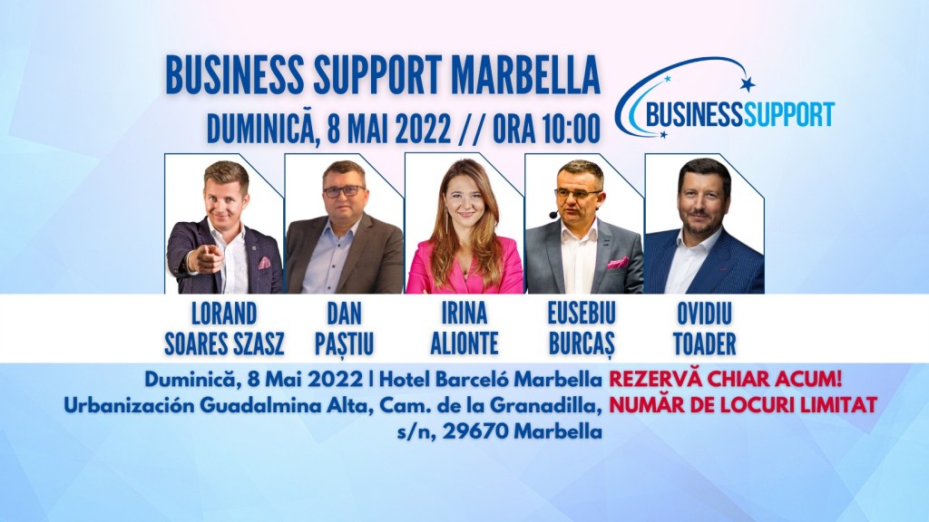 BUSINESS SUPPORT MARBELLA va avea loc duminică, în data de 8 mai 2022 la Hotel Barceló Marbella, Urbanización Guadalmina Alta, Cam. de la Granadilla, s/n 29670, Marbella, începând cu ora 10:00.