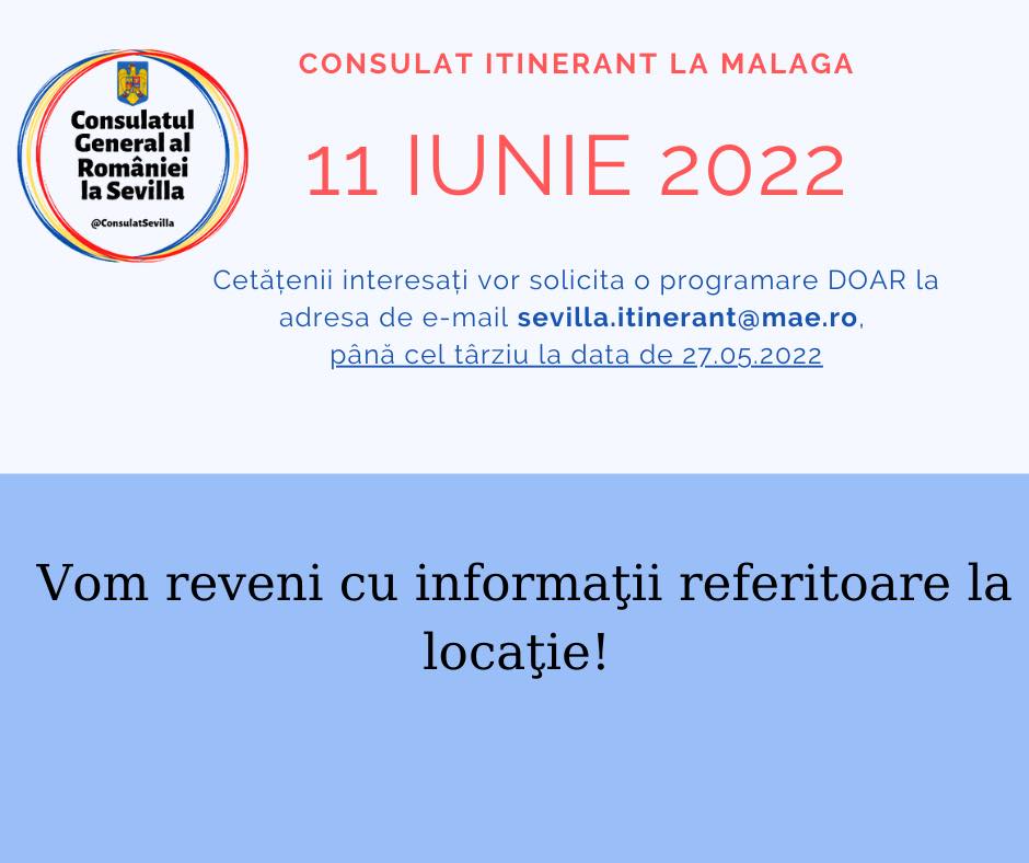 Vă informăm că sâmbătă, 𝟭𝟭 𝗶𝘂𝗻𝗶𝗲 𝟮𝟬𝟮𝟮, între orele 𝟏𝟎:𝟎𝟎 -𝟏𝟖:𝟎𝟎, Consulatul General al României la Sevilla va organiza un 𝐜𝐨𝐧𝐬𝐮𝐥𝐚𝐭 𝐢𝐭𝐢𝐧𝐞𝐫𝐚𝐧𝐭 𝐥𝐚 𝐌𝐚𝐥𝐚𝐠𝐚 menit să furnizeze servicii și asistență consulară cetățenilor români aflați în regiune.