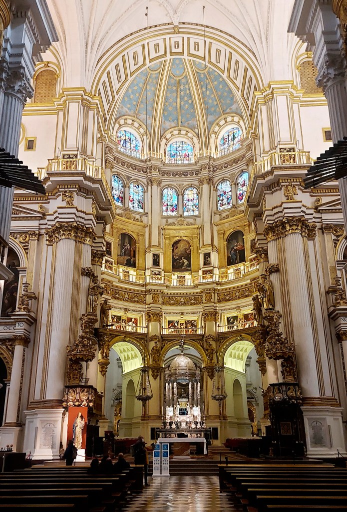 Odată ce pășim în lăcașul sfânt, vom rămâne impresionați de luminozitatea sa, de coloanele albe dispuse in grupuri de 5 coloane corintice unite, cu o înălțime considerabilă, ce ne duce cu gândul la palatele romane. Odată ce ne apropiem, ne atrag atenția cele două orgi imense, ornamentate cu decorațiuni aurite, realizate in 1745-1749 de Leonardo Fernández Dávila. Partea cea mai impresionantă o reprezintă cupola de 45 de metri înălțime din altarul principal realizată de Siloe cu frumoasele vitralii de Juan de Camp în care se prezintă momentele cele mai importante din viața Mântuitorului și superbele pictori ce ilustrează viața Fecioarei Maria – opera lui Alonso Cano. Imaginea centrală reprezintă momentul Intrupării Duhului Sfânt. Putem observa cum cerul se deschide, Duhul Sfânt este reprezentat printr-un punct de lumină și îngerul Gabriel își coboară aripile în semn de supunere. De-a dreptul fascinantă pictura lui Alonso Cano. Tot în cupola centrală, mai jos, se pot observa cele 12 statui aurite unde sunt reprezentați Sfinții Apostoli și statuile Regilor Catolici în genunchi, în semn de rugăciune și deasupra lor, busturile lui Adam și Eva.