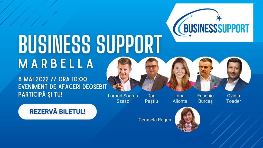BUSINESS SUPPORT MARBELLA va avea loc duminică, în data de 8 mai 2022 la Hotel Barceló Marbella, Urbanización Guadalmina Alta, Cam. de la Granadilla, s/n 29670, Marbella, Spania, începând cu ora 10:00. În fiecare ediție, am avut invitați specializați în teme precum vânzări, marketing tradițional, marketing pe Internet, dezvoltare personală și de afaceri.