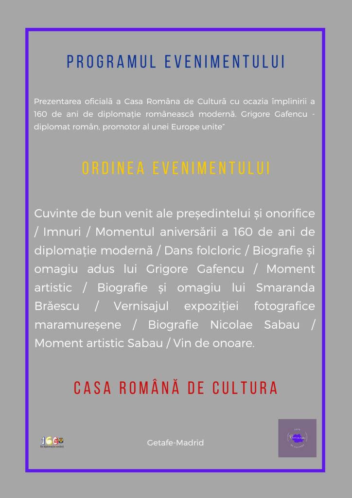 Jose G Garcia: Casa Română de Cultură este o asociație care s-a născut cu preocuparea ca românii și copiii născuți in Spania să aibă un loc de intâlnire cu originile, să-și cunoască rădăcinile și să-și mențină obiceiurile. La fel, ne dorim să fie și o referință la nivel cultural. Membrii sunt acceptati in mod gratuit, iar evenimentele sau activitățile sunt, de asemenea, gratuite, nu se percep taxe. Proiectul din acest an, in special pe 30 iulie, se concentrează pe aniversarea a 160 de ani a diplomației moderne. A doua parte este despre biografia lui Grigore Gafencu, promotor al unei Europe Unite, și despre Smaranda Brăescu, intrucât este un an dedicat ei. Partea a treia este constituita din expozitia fotografica “Maramureșul, ușa tradiției“, in colaborare cu Centrul Județean pentru Conservarea si Promovarea Culturii Tradiționale „Liviu Borlan” din Maramureș, impreună cu un moment artistic dedicat lui Nicolae Sabau.