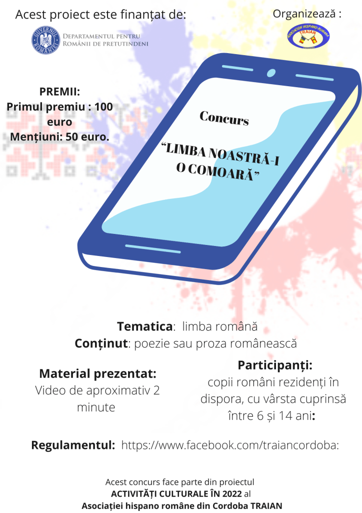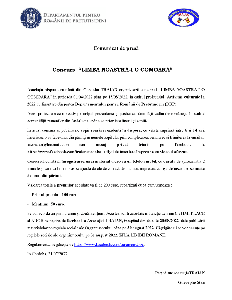 Asociația hispano română din Cordoba TRAIAN organizează concursul “LIMBA NOASTRĂ-I O COMOARĂ” în perioada 01/08/2022 până pe 15/08/2022, în cadrul proiectului Activități culturale în 2022 cu finanțare din partea Departamentului pentru Românii de Pretutindeni (DRP).