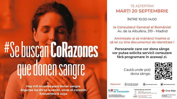 Marți, 20 septembrie, Ambasada României în Regatul Spaniei și Consulatul General al României la Madrid participă la campania de donare de sânge desfășurată de Crucea Roșie.