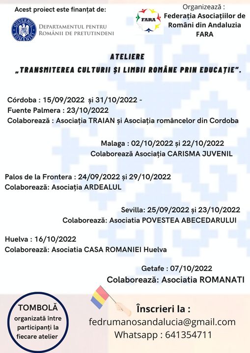Ateliere „Transmiterea culturii și limbii române prin educație ” în Cordoba, Malaga, Palos de la Frontera, Huelva, Sevilla, Fuente Palmera, El Ejido și Getafe.