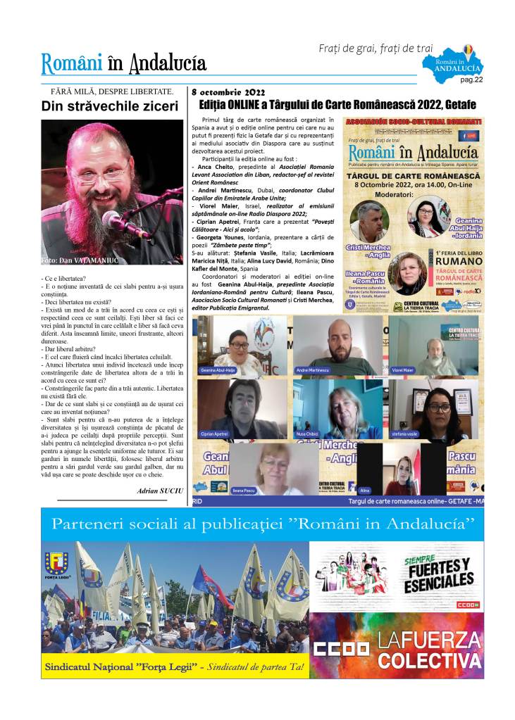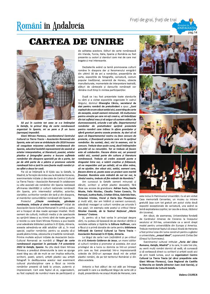 A apărut numărul 13 al Publicației ”Români in Andalucía – Frați de grai, frați de trai”, Octombrie, 2022, un număr dedicat Târgului de Carte Românească 2022 – Ediția 1, Getafe, Madrid, Spania