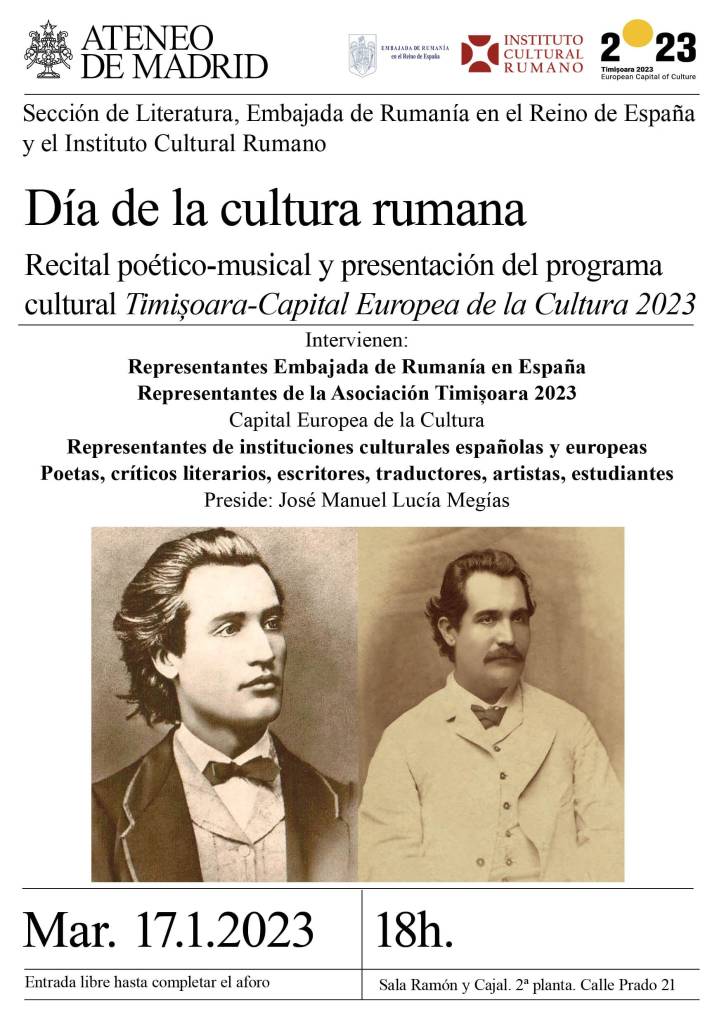 En el marco del Día de la Cultura Rumana, el martes, 17 de enero de 2023, el Instituto Cultural Rumano de Madrid, la Sección de la Literatura del Ateneo de Madrid y la Embajada de Rumanίa en el Reino de España, en colaboración con la Asociación Timișoara-Capital Europea de la Cultura 2023 y el Lectorado de rumano de la Universidad Complutense de Madrid, organizan una actividad en la que se evocará, desde una perspectiva multidisciplinaria, la personalidad artística del poeta nacional Mihai Eminescu, a 173 años de su nacimiento.