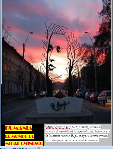 Mi acercamiento a la Cultura Rumana me lleva en el día de hoy en participar en el homenaje a Mihai Eminescu el que fuera elegido como baluarte de la cultura Rumana representando en el día que éste Nació El 15 de Enero de 1850, en (BOTOSANI). Rumania, pasando su niñez en un pueblo cercano llamado Ipotesti, donde rodeado de un ambiente lirico, se desarrollo entorno a la contemplación de la influencia Religiosa y Campesina.