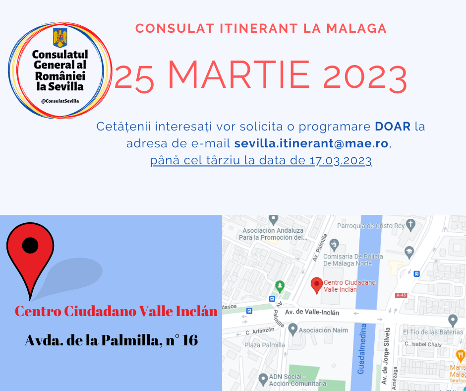 Vă informăm că sâmbătă,𝟐𝟓 𝐦𝐚𝐫𝐭𝐢𝐞 𝟐𝟎𝟐𝟑, î𝐧𝐭𝐫𝐞 𝐨𝐫𝐞𝐥𝐞 𝟏𝟎.𝟎𝟎-𝟏𝟖.𝟎𝟎, Consulatul General al României la Sevilla va organiza un 𝗰𝗼𝗻𝘀𝘂𝗹𝗮𝘁 𝗶𝘁𝗶𝗻𝗲𝗿𝗮𝗻𝘁 𝗹𝗮 𝗠𝗮𝗹𝗮𝗴𝗮 menit să furnizeze servicii consulare cetățenilor români aflați în regiune.