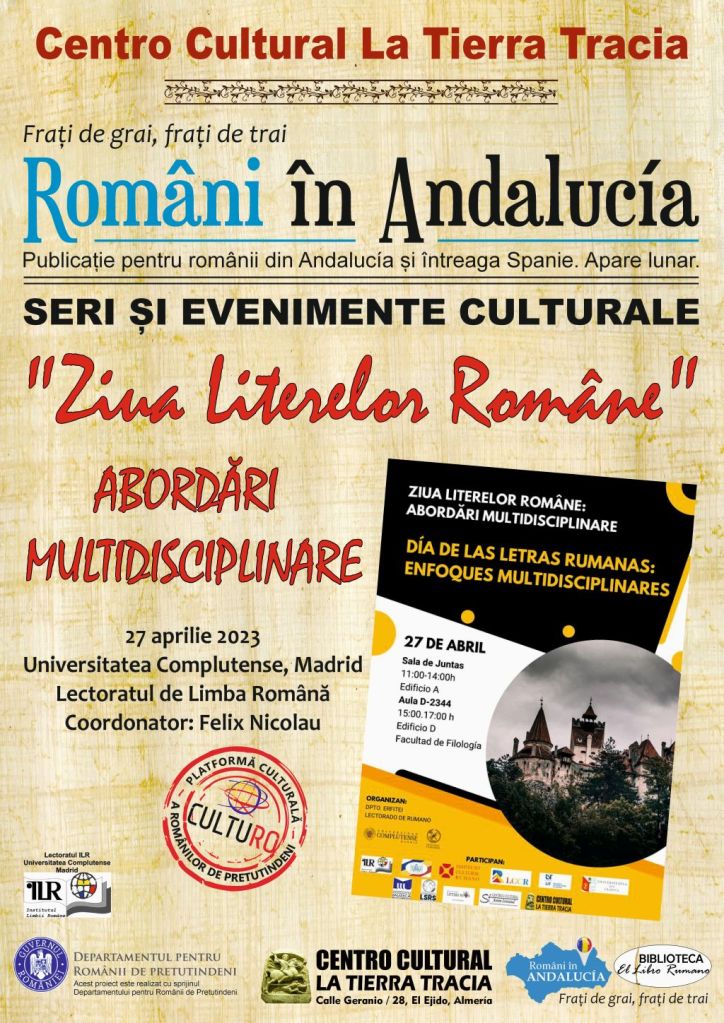 Joi, 27 Aprilie 2023 vă așteptăm la Lectoratul ILR de la Universitatea Complutense din Madrid in cadrul unui eveniment la care vor participa Ambasada României în Spania, ICR Madrid, LCCR (profesorii de Limba Română din Spania tutelați de Institutul Limbii Române ), Universitatea de Vest din Timișoara, Universitatea din Craiova, Universitatea Națională de Muzică din București, Liga Studenților Români din Spania, Revista Littera Nova, Centrul Cultural La Tierra Tracia , traducători, scriitori și studenți.