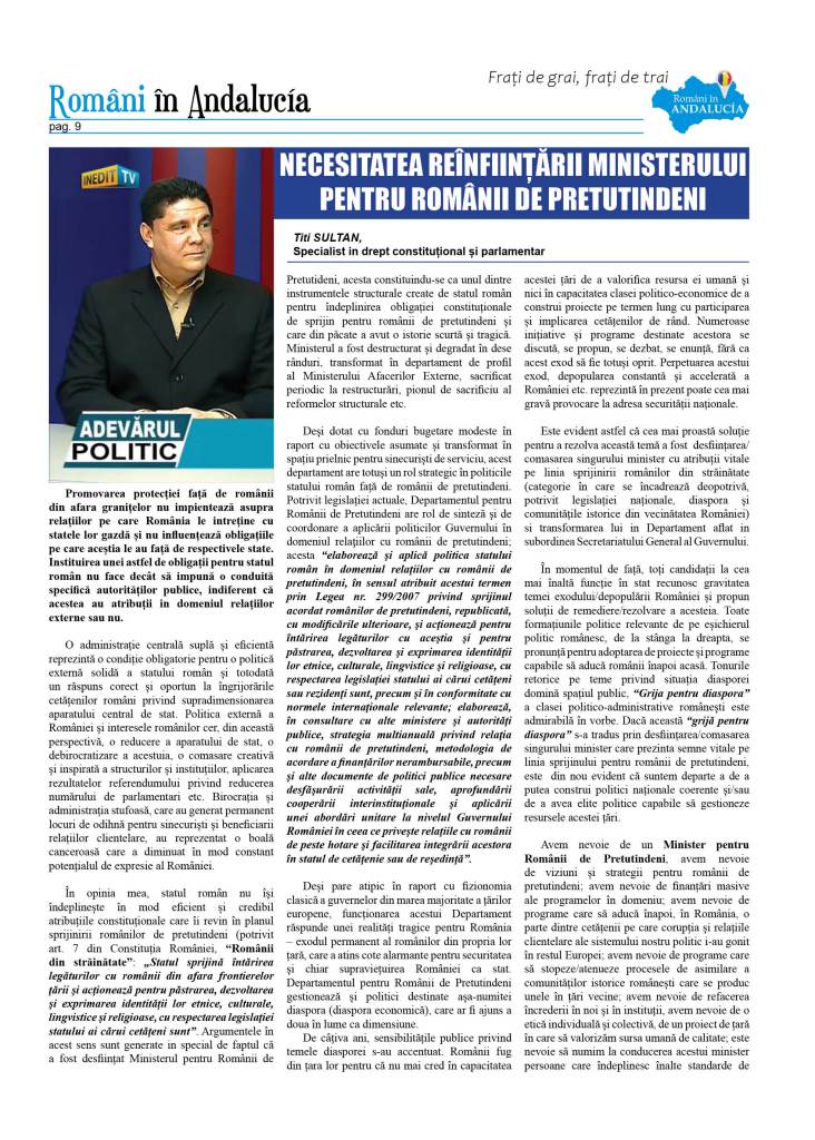 – Editorial: Titi Sultan – NECESITATEA REÎNFIINȚĂRII MINISTERULUI PENTRU ROMÂNII DE PRETUTINDENI