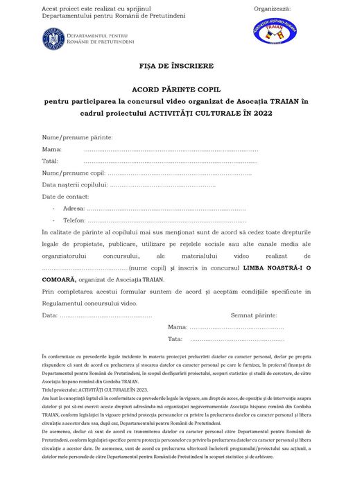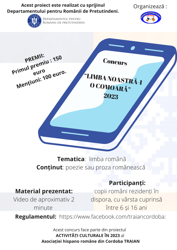 In perioada iulie-august 2023 Asociația hispano română din Cordoba TRAIAN desfășoară concursul “LIMBA NOASTRĂ-I O COMOARĂ”, concurs organizat în cadrul proiectului ACTIVITĂȚI CULTURALE ÎN 2023 și finanțat de Departamentului pentru Românii de Pretutindeni.