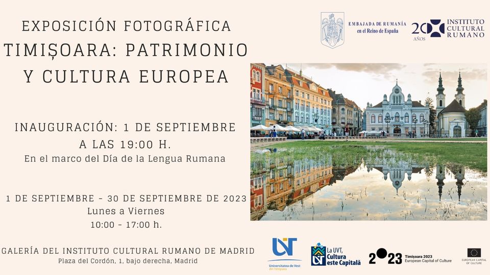 Din seria evenimentelor dedicate celebrării Zilei Limbii Române (31 august), în perioada 1-30 septembrie, vă invităm să vizitați în Galeria ICR Madrid expoziția fotografică dedicată Timișoarei – Capitală Europeană a Culturii 2023: „Timișoara – patrimoniu și cultură europeană”.