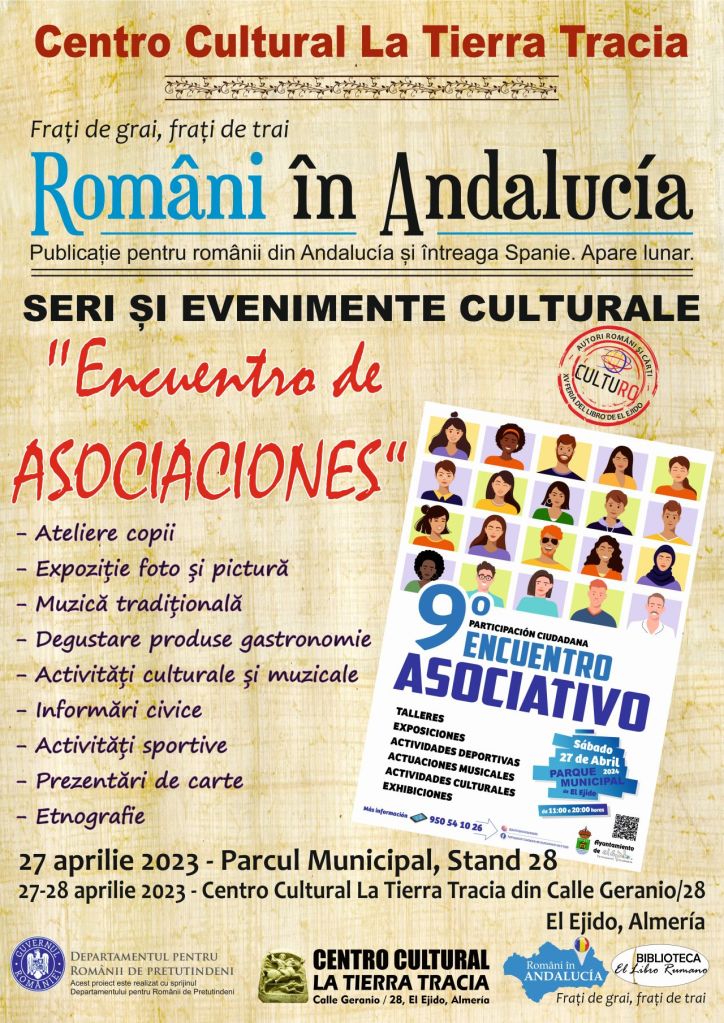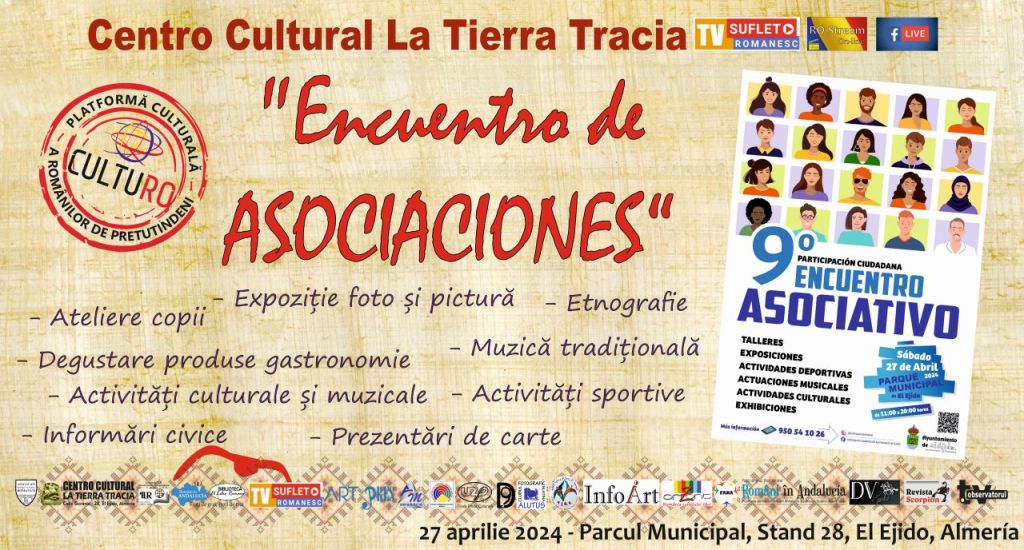 In cadrul proiectele socio-culturale „Citește românește, gândește românește, trăiește și simte românește“ și „Cultura populară și meșteșugurile tradiționale – punți de legătură pentru românii din Andalucia“, Centrul Cultural La Tierra Tracia vă așteaptă in 27 și 28 aprilie 2024 la o serie de evenimente sociale și culturale ce se vor desfășura in Parcul Municipal din El Ejido, Almería și la sediul Centrului din Calle Geranio/28, El Ejido la cea de-a 9-a Reuniune Asociativă a organizațiilor societății civile din Almería, Andalucía.
