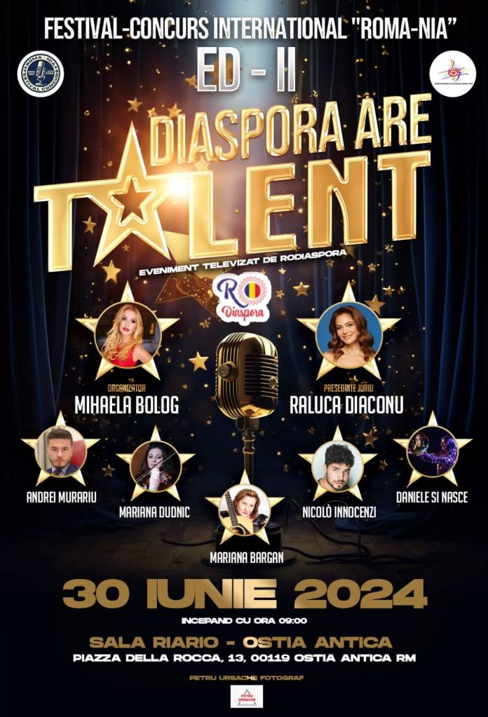 După succesul primei ediții, pe 30 iunie, la Roma, am asistat, din nou, la un adevărat maraton al talentelor românești din diaspora. Este vorba despre primul Talent Show adresat românilor de toate vârstele de peste granițe, Festivalul Concurs ROMA-NIA. Finala, care a durat pe parcursul a 12 ore, s-a desfășurat într-una din cele mai prestigioase locații din Ostia Antica (Roma) Sala Riario. Este o sală care are valoarea unui muzeu datorită frescelor din 1500 care îi împodobesc pereții, fresce care reprezintă chiar scene de pe Columna lui Traian.