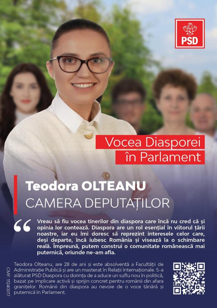 Susținerea tinerilor din diaspora este esențială pentru viitorul României! Participarea voastră la vot aduce schimbarea și asigură că vocea voastră contează în Camera Deputaților. Votați și fiți parte din deciziile care modelează viitorul țării! – Teodora Olteanu
