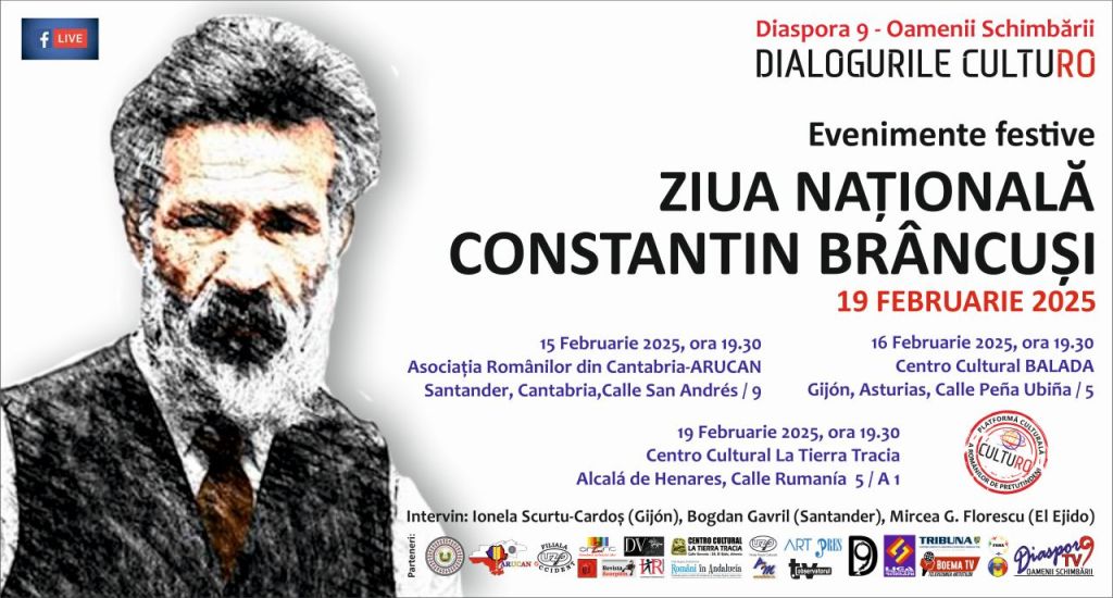 Vă așteptăm alături de noi la Centro Cultural La Tierra Tracia, din Calle Rumanía 5/ A 10, Alcalá de Henares, Madrid, miercuri, 19 Februarie 2025 de la ora 19.30 la o serie de manifestări culturale dedicate Zilei Naționale ”Constantin Brâncuși”, intitulate generic ”BRÂNCUȘI – Măiastra și eterna reintoarcere”