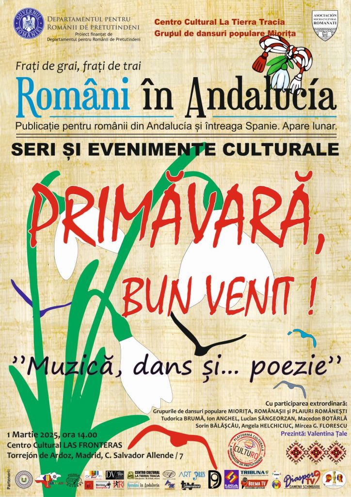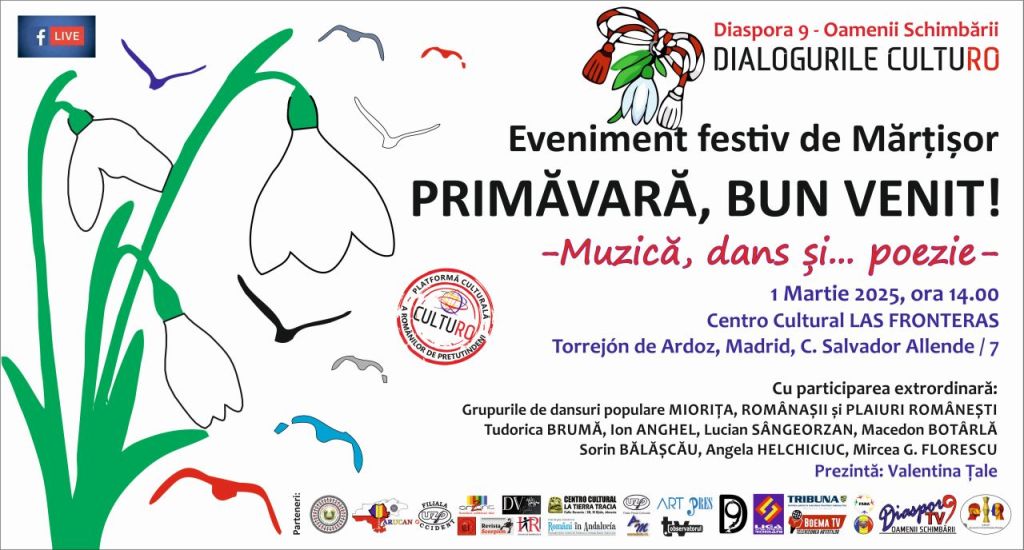 Vă așteptăm alături de noi la Centro Cultural LAS FRONTERAS din Calle Salvador Allende 7, Torrejón de Ardoz, Madrid, Sâmbătă, 1 Martie 2025, intre orele 14.00 – 17.00, la un eveniment festiv dedicat ZILEI MĂRȚIȘORULUI cu participarea extraordinară a Grupurilor de dansuri populare MIORIȚA, ROMÂNAȘII și PLAIURI ROMÂNEȘTI, precum și a artiștilor Tudorica BRUMĂ, Ion ANGHEL, Macedon BOTÂRLĂ, Lucian SÂNGEORZAN, Sorin BĂLĂȘCĂU, Angela HELCHICIUC, Mircea G. Florescu.