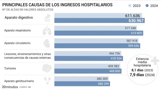 În anul 2024, pentru al doilea an consecutiv, afecțiunile aparatului digestiv s-au situat pe primul loc în topul afecțiunilor care necesită spitalizare în Spania, înregistrând o creștere de 3,2% față de anul precedent. Pe de altă parte, bolile sistemului respirator au urcat pe locul al doilea, depășind bolile sistemului circulator, conform sondajului privind incidența spitalizărilor, publicat joi de Institutul Național de Statistică (INE).
